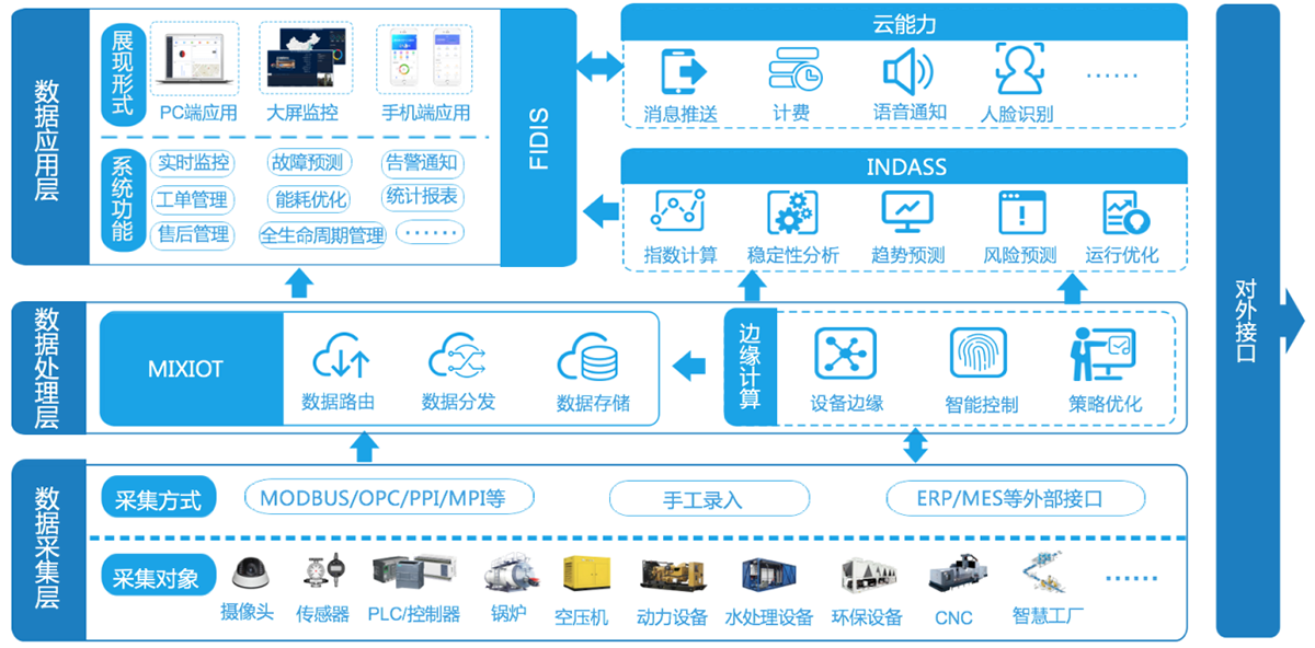 沅力泛工業物聯網支持全工業設備接入,且可實現設備間協同控制。系統采用分層設計,共分為三層:數據采集層(適配器),數據支持層(MIXIOT云平臺)、應用層(FIDIS應用系統)。