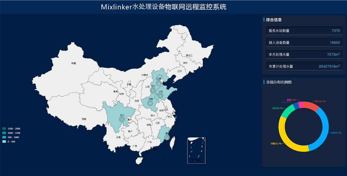 通過GIS、GPS地圖展示站點分布位置,全方位掌握所有站點的整體運維狀況,實時采集污水站點系統設備的運行參數(開關機狀態、設備壓力、設備處理水量以及水質參數),實現狀態監控、視頻監控的實時上傳。