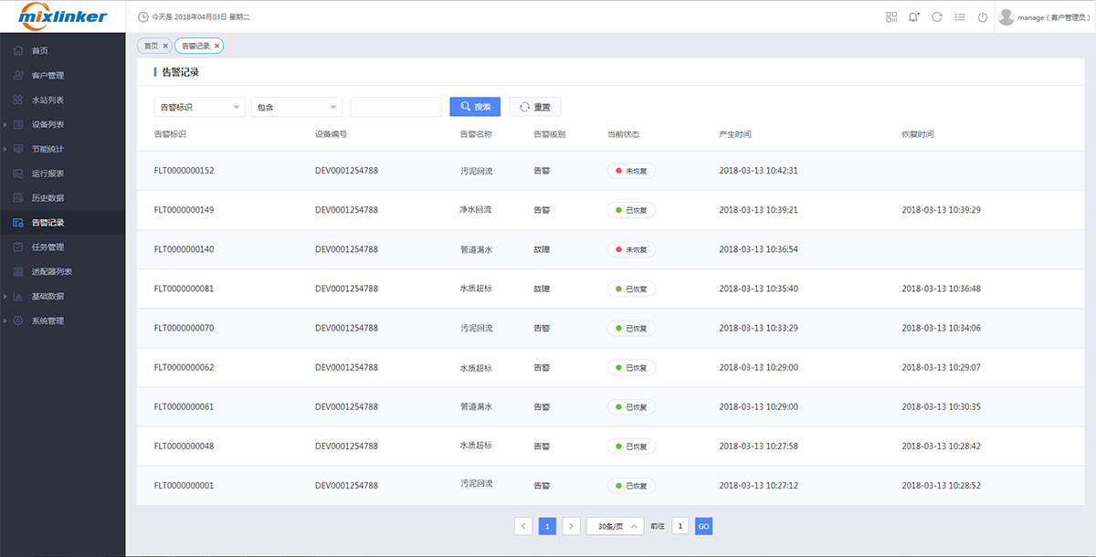 針對設備設置故障參數閥值,觸發閥值范圍,會自動觸發故障報警,以彈屏或短信、電話的形式通知相關管理人員(關機狀態下以短信形式通知關聯人),生成故障記錄,工單會自動分配到負責人,方便及時發現和及時維修。
