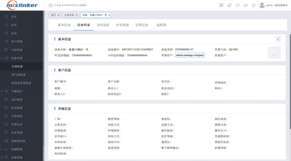 以項目為基礎,將不同項目的設備匹配對應客戶單元為中心,關聯統計各設備詳情,包括設備型號規格、運維記錄、保養信息等信息,通過建立完善的設備電子檔案,為設備的日常管理(維護、維修等)提供詳盡數據支持。