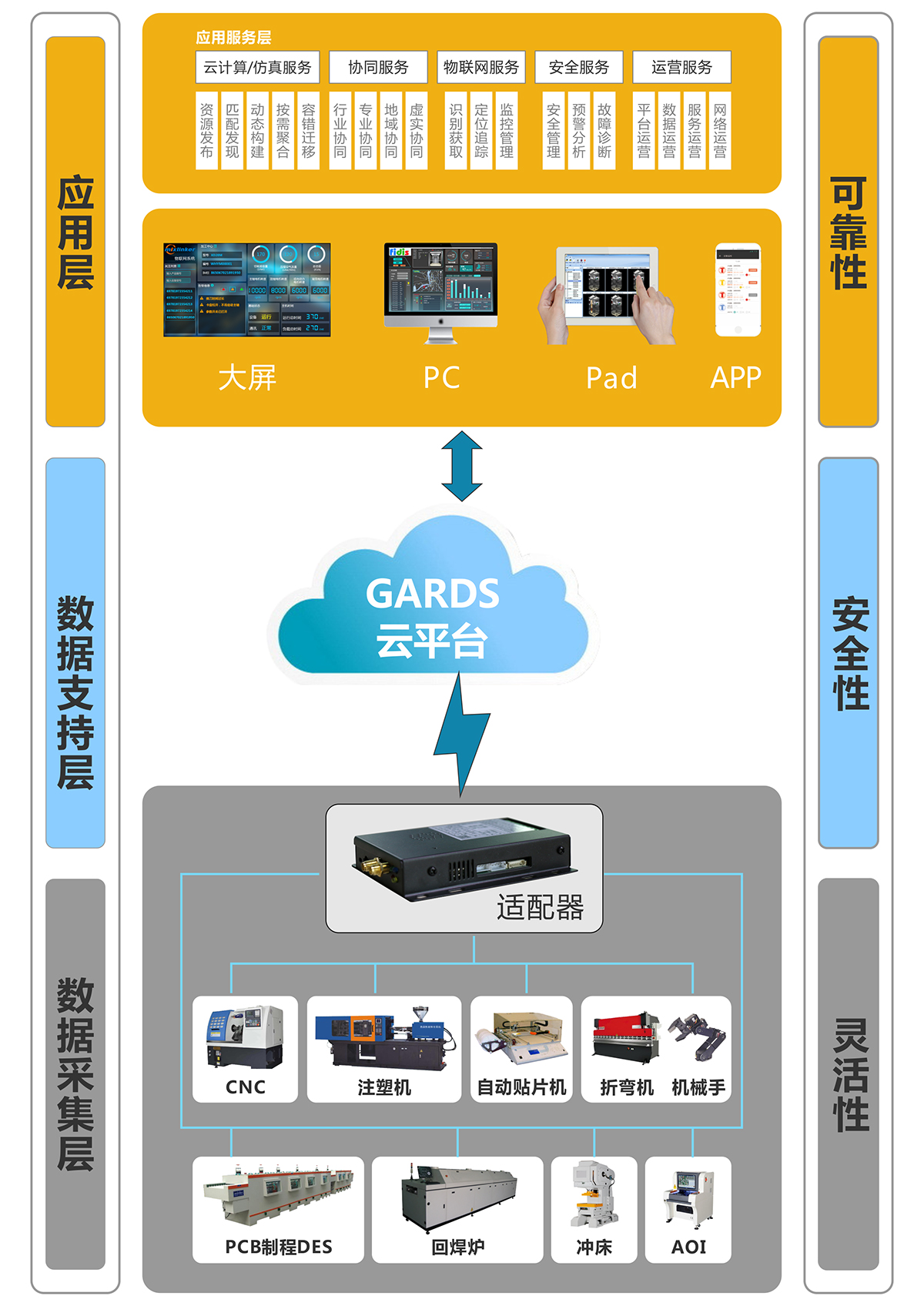 沅力UNET物聯網系統采用分層結構設計,共分為三層:數據采集層(適配器)、數據支持層(Gards云平臺)、應用層(FIDIS應用系統)。